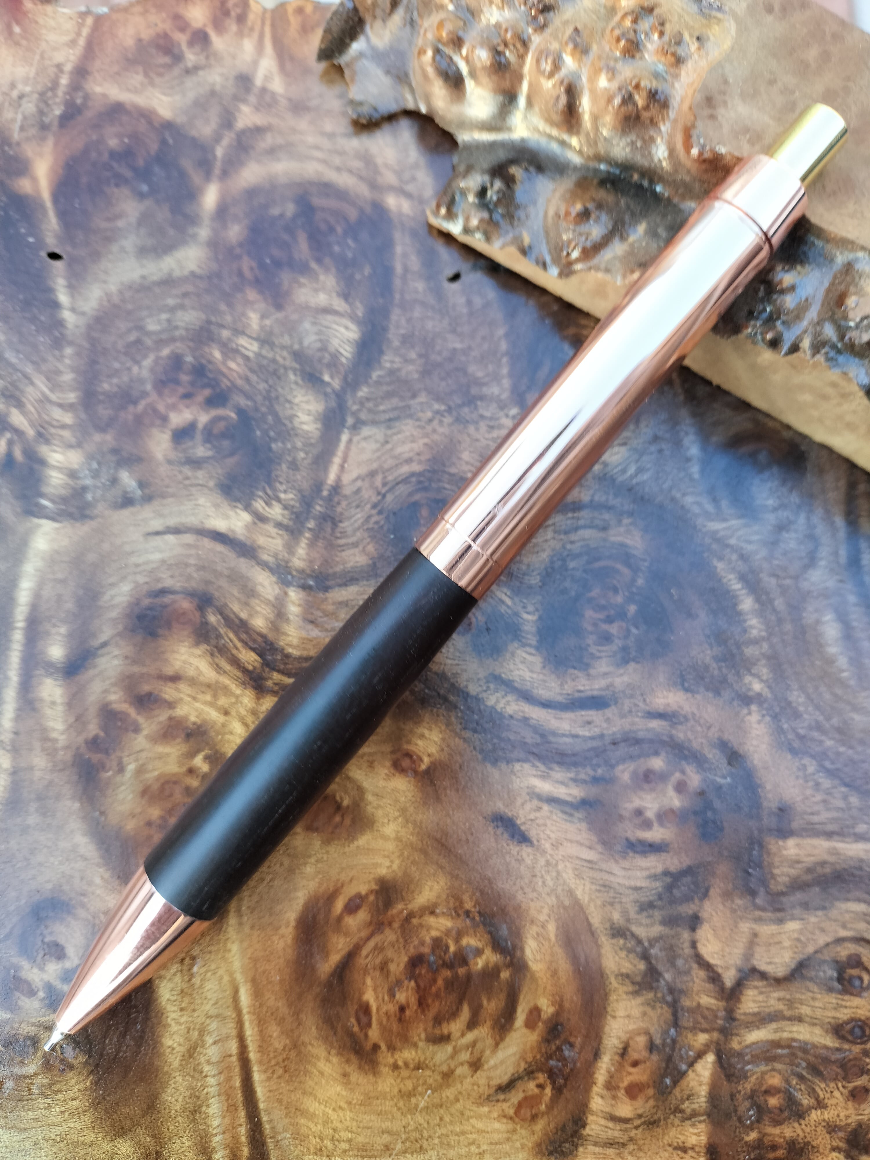 Bâton D'or(バトンドール)のツイストボールペンの金具をカスタマイズしたコラボカスタムシャープペンシルです。コッパーカラーが美しく形状もエレガントな設計となっております。